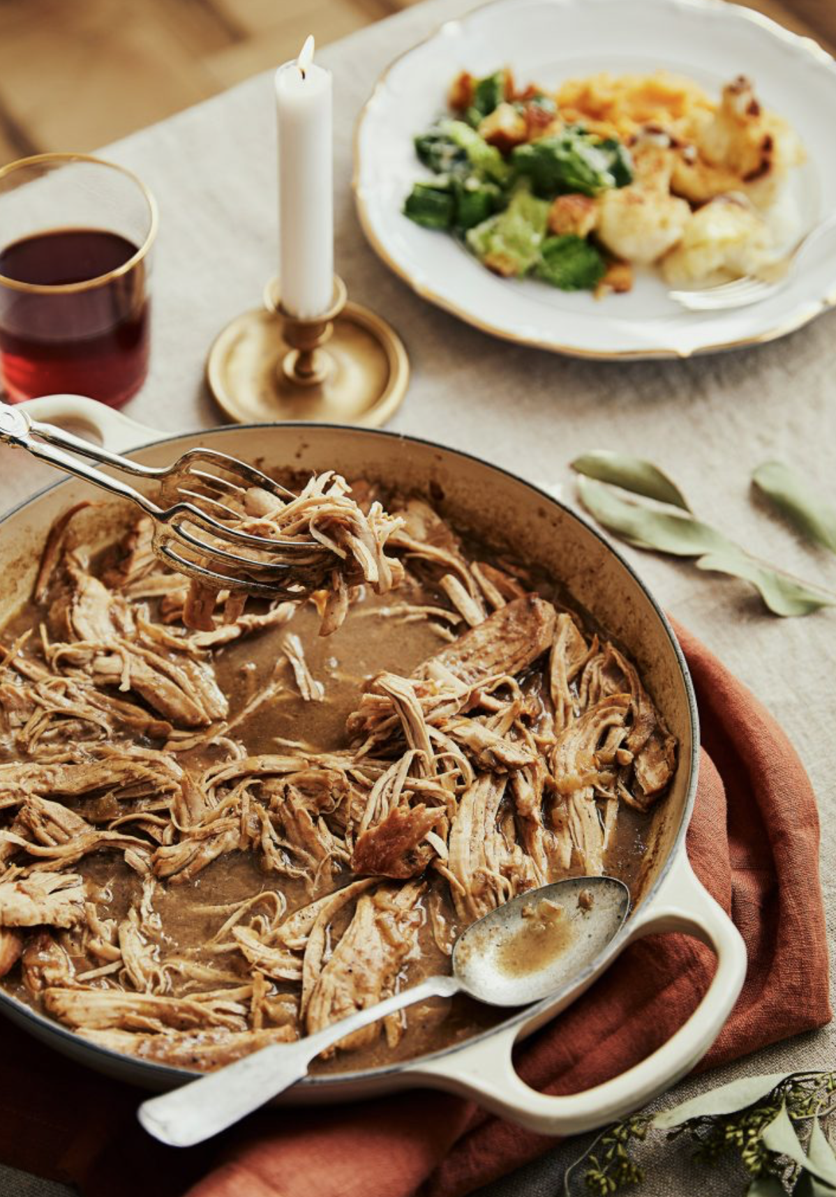 5. À l’aide de 2 fourchettes, effilocher délicatement la dinde, puis servir avec la sauce.