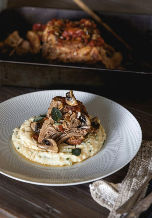 - Dans une autre casserole, porter le lait à ébullition, puis verser la polenta tout en fouettant continuellement pendant 2 minutes, ou jusqu’à l’obtention d’une texture épaisse. Ajouter la purée de chou-fleur, le parmesan, le sel, la ciboulette et le poivre. Bien remuer, puis servir avec la viande.