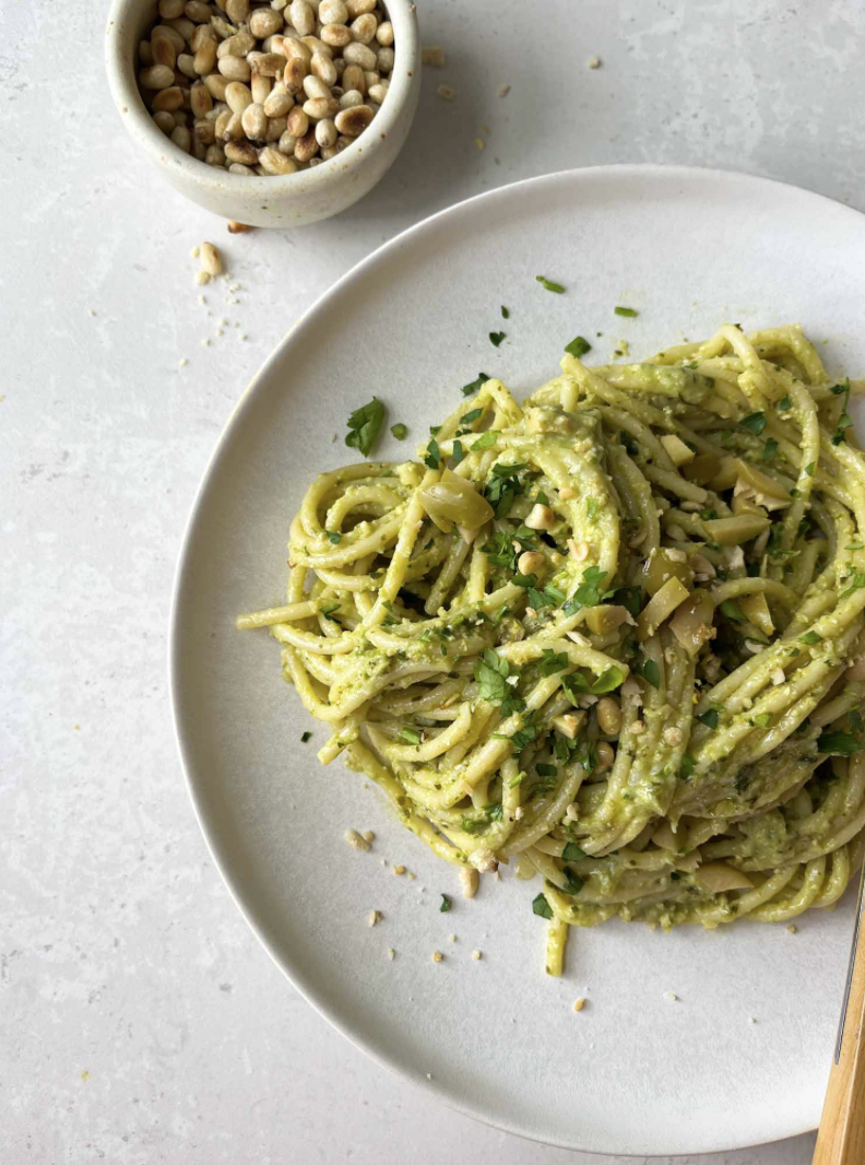 2. Dans la même casserole, mélanger les pâtes avec le pesto et l’eau de cuisson. Servir avec le persil et les olive