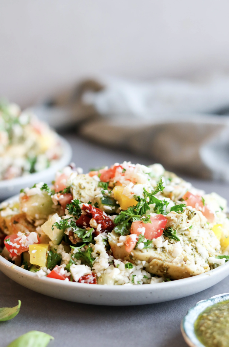 - Préchauffez votre air fryer à 350°F. Badigeonner les poitrines de poulet de pesto puis déposer dans le compartiment du air fryer. Chauffer pendant 18 à 20 minutes ou jusqu’à ce que le poulet soit bien cuit.